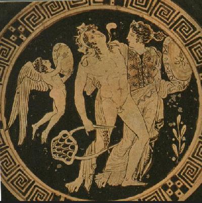 En esta época la cerámica ática prolonga las directrices del siglo precedente sin renovarlo pero refleja mayor negligencia en el dibujo. Aquí aparece Ariadna sujetando a un Dioniso ebrio y acompañados por Eros-Cupido que tañe una pandereta, instrumento musical que también lleva en su brazo izquierdo Ariadna y que tocaban los miembros del cortejo del dios. |