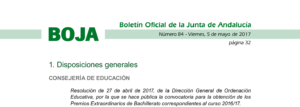 Premios extraordinarios de Bachillerato Administrador 9 mayo, 2017 Centro 0 comentarios Resolución de 27 de abril de 2017, de la Dirección General de Ordenación Educativa, por la que se hace pública la convocatoria para la obtención de los Premios Extraordinarios de Bachillerato correspondientes al curso 2016/17. Acceder al BOJA… Etiquetados Bachillerato, Premios Navegación de entradas Anterior Entrada anterior: Cadena literaria 2017Siguiente Entrada siguiente: Hazte socio del AMPA Deja una respuesta Cancelar la respuestaLo siento, debes estar conectado para publicar un comentario.