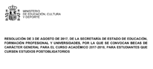 RESOLUCIÓN DE 3 DE AGOSTO DE 2017, DE LA SECRETARÍA DE ESTADO DE EDUCACIÓN, FORMACIÓN PROFESIONAL Y UNIVERSIDADES, POR LA QUE SE CONVOCAN BECAS DE CARÁCTER GENERAL PARA EL CURSO ACADÉMICO 2017-2018, PARA ESTUDIANTES QUE CURSEN ESTUDIOS POSTOBLIGATORIOS.