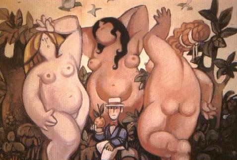 El estilo del popular dibujante autor de esta pintura es sobradamente reconocible. Aquí recrea el mito del Juicio de Paris bajo un prisma muy particular y personal. Las tres divinidades femeninas están representadas de manera distorsionada por su gordura. Puede ser un homenaje a Rubens. Rodean a un joven, elegantemente vestido, que además de por el título del cuadro, adivinamos su identidad porque lleva en la mano una manzana, la manzana de la discordia. Es una trasposición a nuestro tiempo de la personalidad que el autor imagina en el Paris mitológico. |