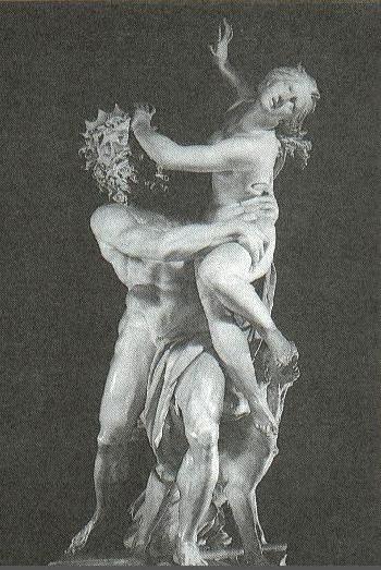 El más grande escultor del barroco italiano. A partir de este mito trata el tema de la violencia siguiendo los modelos de la escultura helenística. El poderoso cuerpo del dios, el de un varón maduro, se encamina hacia delante y el juvenil y femenino cuerpo de Prosérpina no pisa el suelo pero tiende hacia atrás sus brazos, pidiendo ayuda con uno y rechazando la cabeza del dios con el otro. En cuanto a la composición es una línea vertical a la que se contraponen tres brazos en horizontal, los dos del dios y uno de la joven. Las manos de Plutón se hunden en el cuerpo terso de la joven y la carne cede bajo la presión. La ceja del dios se deforma bajo el empuje de la mano de la diosa. A los pies de la estuatua el can cerbero, el monstruoso animal que guarda las puertas del reino de Plutón. Es una de las imágenes más naturalistas de la historia de la escultura. |