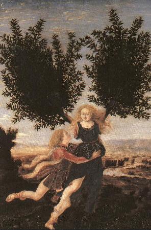 Este pintor y escultor, junto con su hermano Piero, trabajan en Florencia en la segunda mitad del siglo XV y pertenecen al primer renacimiento. Sigue el relato mítico pero viste a sus personajes con trajes a la moda florentina de su tiempo y les da el aspecto idealizado en este movimiento. El paisaje reflejado en el cuadro es probablemente el valle del río Arno, en las afueras de Florencia. Lo de incluir paisajes locales es un rasgo de los pintores del renacimiento. Esta pintura, por su pequeño tamaño y forma, pudo formar parte de una puerta o ser la tapadera de un cofre. |