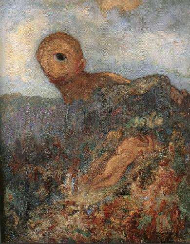 Una personal visión del artista representante del simbolismo. Descubrimos los elementos mitológicos básicos, el Cíclope de un solo ojo observando desde lo alto de la montaña a los jóvenes enamorados. Refleja un mundo onírico y obsesivo que anuncia el surrealismo. |